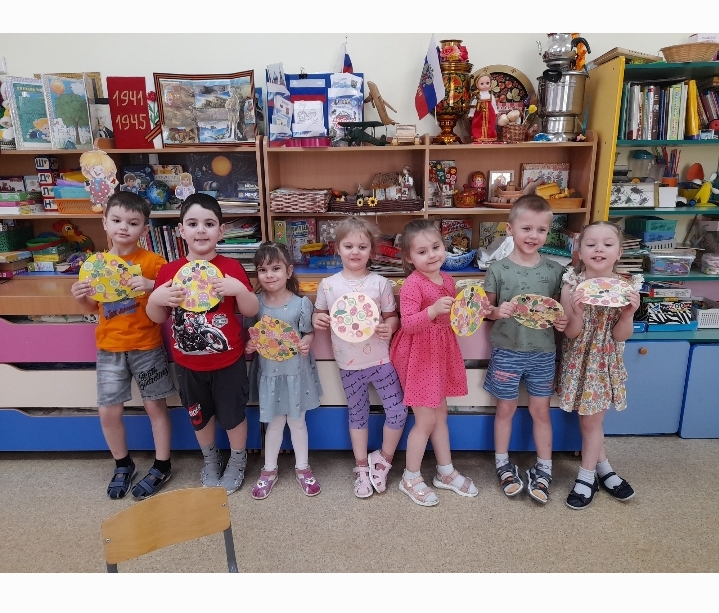 Воспитатель: Вы такие молодцы, у вас получились очень вкусные и румяные пиццы. Я думаю, что Поваренок – Кузя будет очень рад теперь, что у него есть столько вкусной пиццы. Я предлагаю повесить их на выставку и полюбоваться вашими работами.
